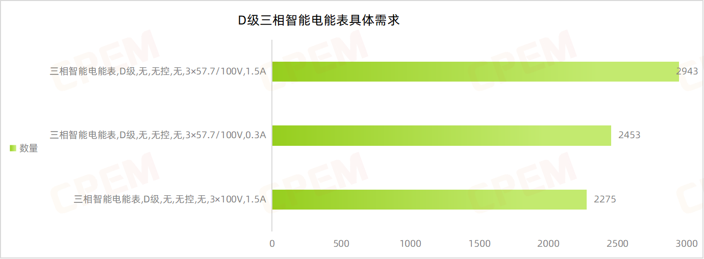 D級三相智能電能表招標(biāo)項目單位共計10個,其中國國網(wǎng)四川省電力公司、國網(wǎng)江蘇省電力有限公司、國網(wǎng)青海省電力公司三個項目單位需求數(shù)量分列前三。D級三相智能電能表下三款產(chǎn)品需求數(shù)比較均衡,其中三相智能電能表,D級,無,無控,無,3×57.7/100V,1.5A該款產(chǎn)品的需求量略高,為2943臺。