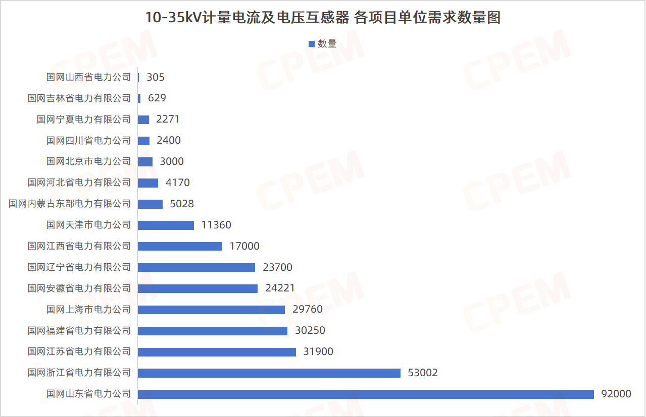 10-35kV計量電流及電壓互感器招標(biāo)項目單位共計16個,其國國網(wǎng)山東省電力公司、國網(wǎng)浙江省電力有限公司、國網(wǎng)江蘇省電力有限公司三個項目單位需求數(shù)量分列前三,計量電磁式電流互感器,LJZN1-10,5-250/5,0.2S和計量電磁式電壓互感器, JDZQN-20,20/0.1,0.2兩款產(chǎn)品的需求量遙遙領(lǐng)先,分別為151899臺和116052臺。