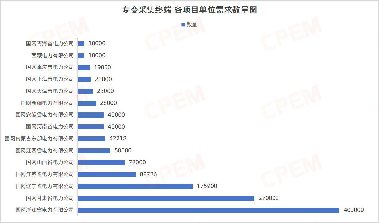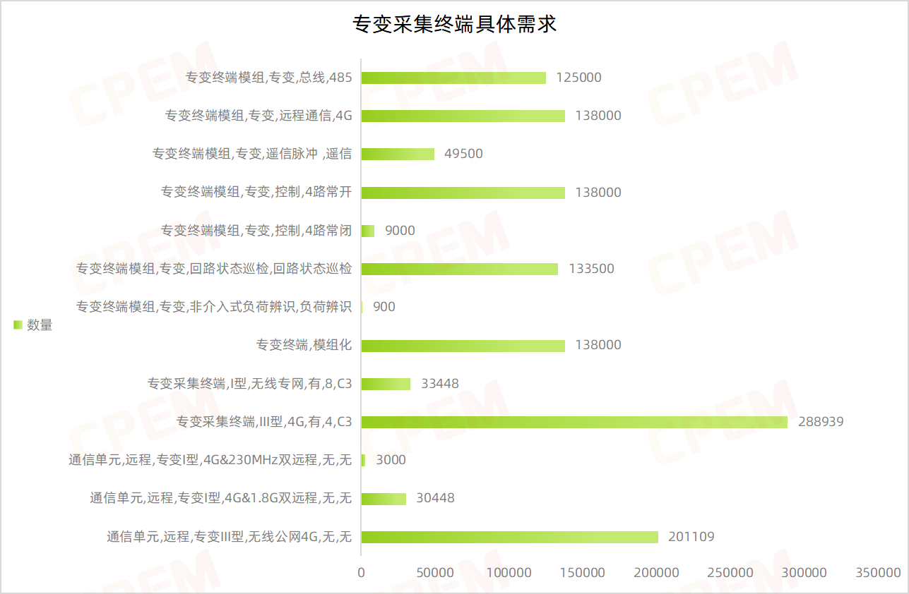 專變采集終端招標(biāo)項目單位共計15個,其國網(wǎng)浙江省電力有限公司、國網(wǎng)甘肅省電力公司、國網(wǎng)遼寧省電力有限公司三個項目單位需求數(shù)量分列前三,專變采集終端,III型,4G,有,4,C3該款產(chǎn)品的需求量最大,達(dá)288939臺。