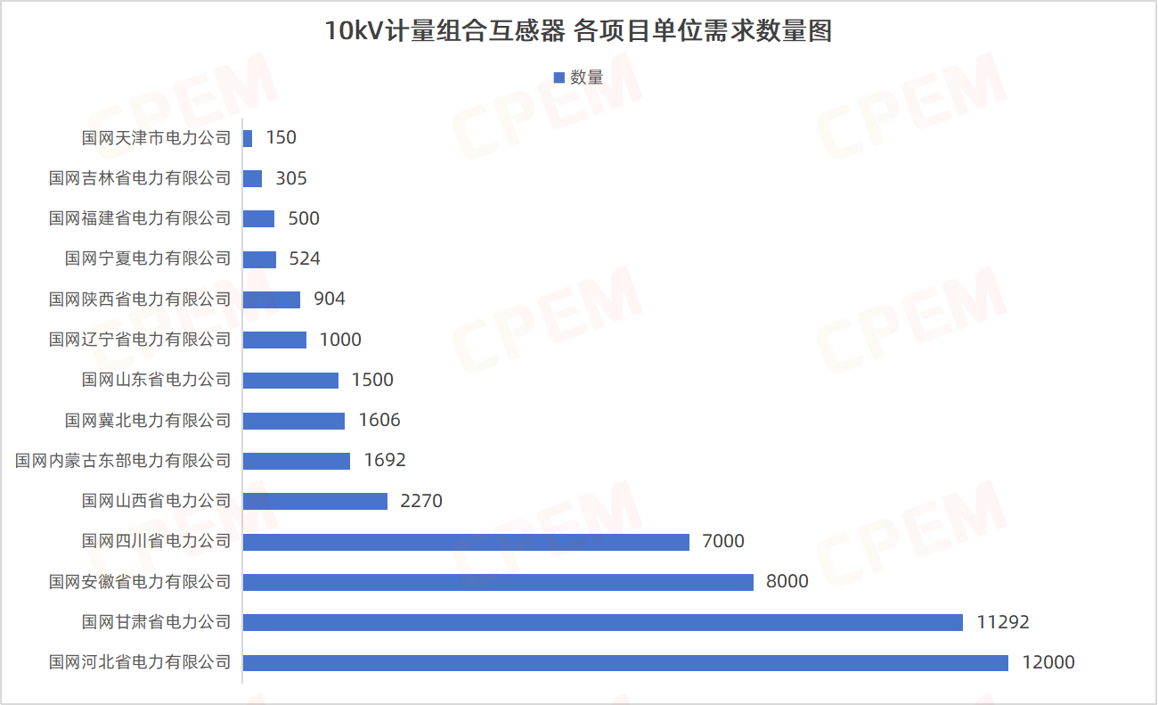 10kV計量組合互感器招標(biāo)項目單位共計14個,其國國網(wǎng)河北省電力有限公司、國網(wǎng)甘肅省電力公司、國網(wǎng)安徽省電力有限公司三個項目單位需求數(shù)量分列前三,計量組合互感器,JZZV1-10,5-600/5、10/0.1,0.2S該款產(chǎn)品的需求量較大,為39576臺。