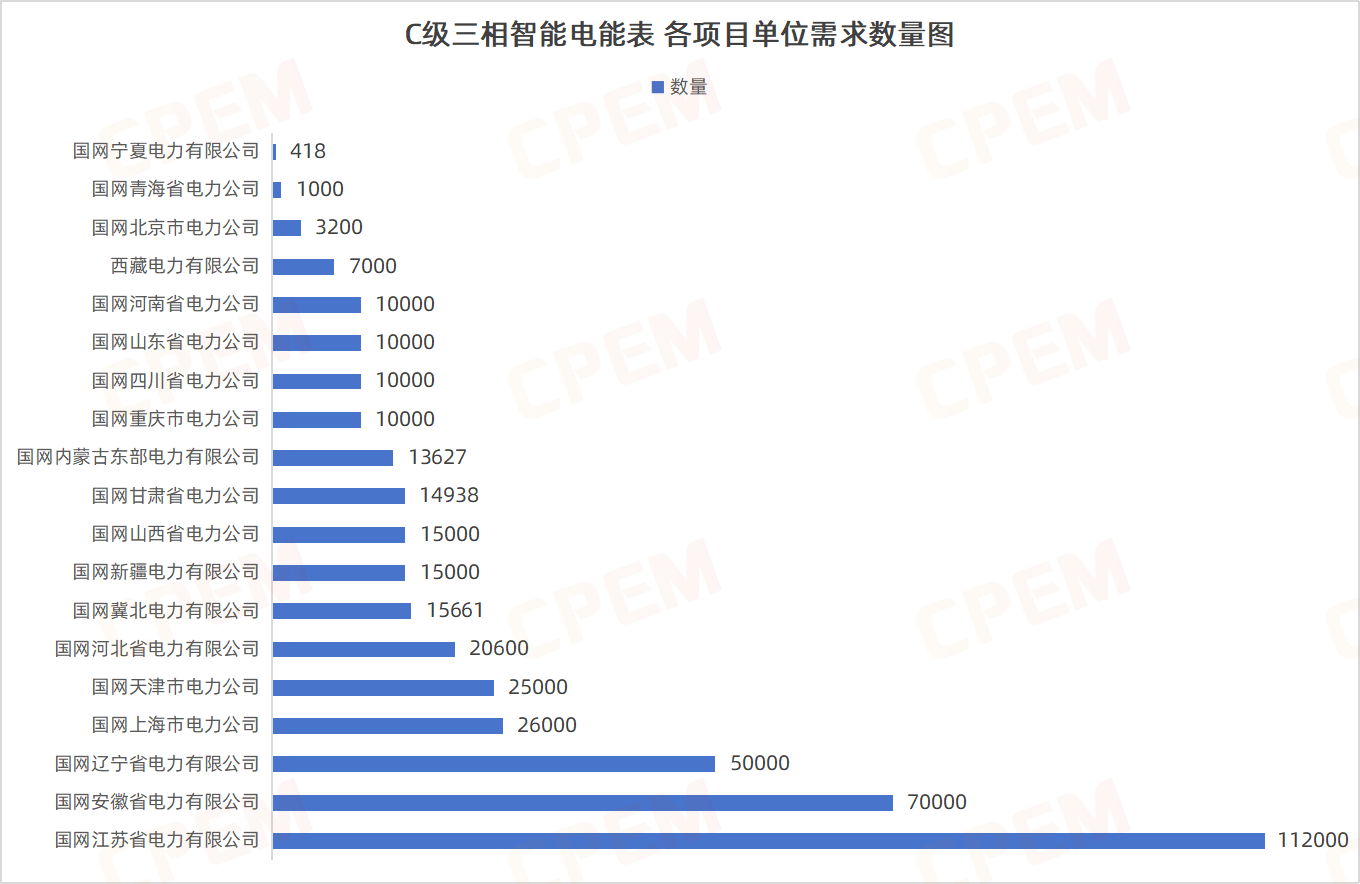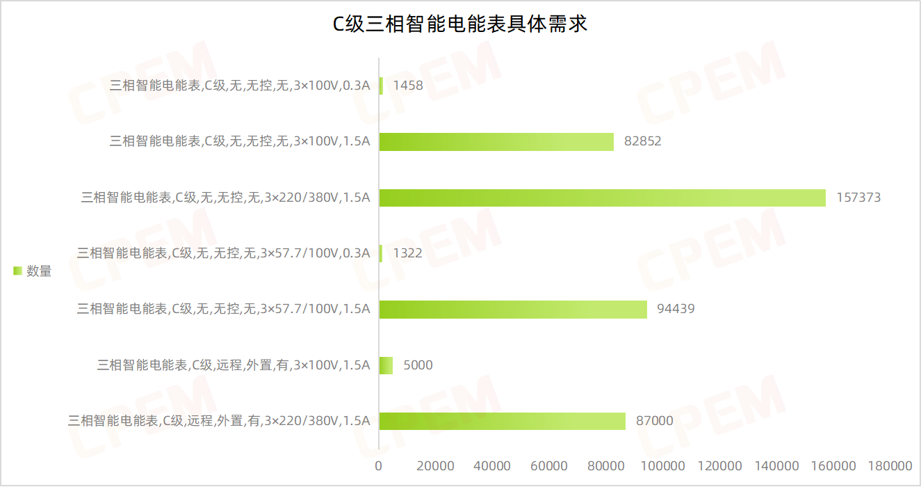 C級三相智能電能表招標(biāo)項目單位共計19個,其中國國網(wǎng)江蘇省電力有限公司、國網(wǎng)安徽省電力有限公司、國網(wǎng)遼寧省電力有限公司三個項目單位需求數(shù)量分列前三,三相智能電能表,C級,無,無控,無,3×220/380V,1.5A該款產(chǎn)品的需求量最大,達(dá)157373臺。