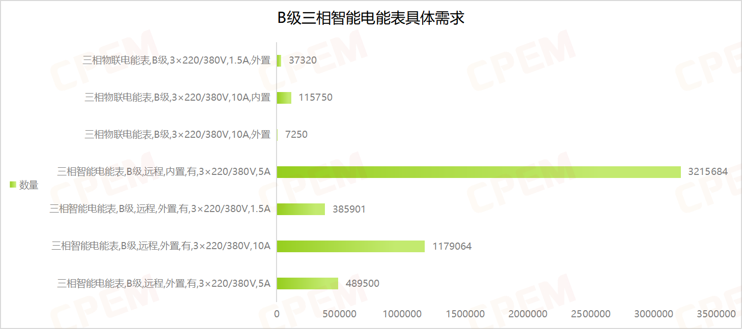 B級三相智能電能表招標(biāo)項目單位共計24個,其中國國網(wǎng)江蘇省電力有限公司、國網(wǎng)福建省電力有限公司、國網(wǎng)吉林省電力有限公司三個項目單位需求數(shù)量分列前三,三相智能電能表,B級,遠(yuǎn)程,內(nèi)置,有,3×220/380V,5A該款產(chǎn)品的需求量最大,達(dá)3215684臺。