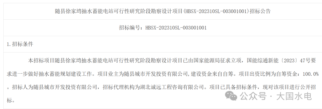 前期階段(2022-2023年)由隨縣城市開發(fā)投資有限公司作為項目前期業(yè)主,負責項目立項、勘察設計及可行性研究招標工作。中國電建集團中南勘測設計研究院有限公司以報價 158796700 元成功中標可行性研究階段勘察設計項目。
