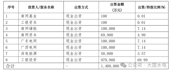 投資人投資情況:南網基金作為該基金的管理人及執行事務合伙人,認繳100萬元;工銀資本作為該基金的執行事務合伙人,認繳100萬元;南網儲能認繳10.00億元,認購份額占比7.14%;廣東電網認繳10.00億元,認購份額占比7.14%;廣西電網認繳10.00億元,認購份額占比7.14%;南網資本認繳6.99億元,認購份額占比4.99%;深電能源認繳5.00億元,認購份額占比3.57%;工銀投資認繳97.99 億元,認購份額占比69.99%。